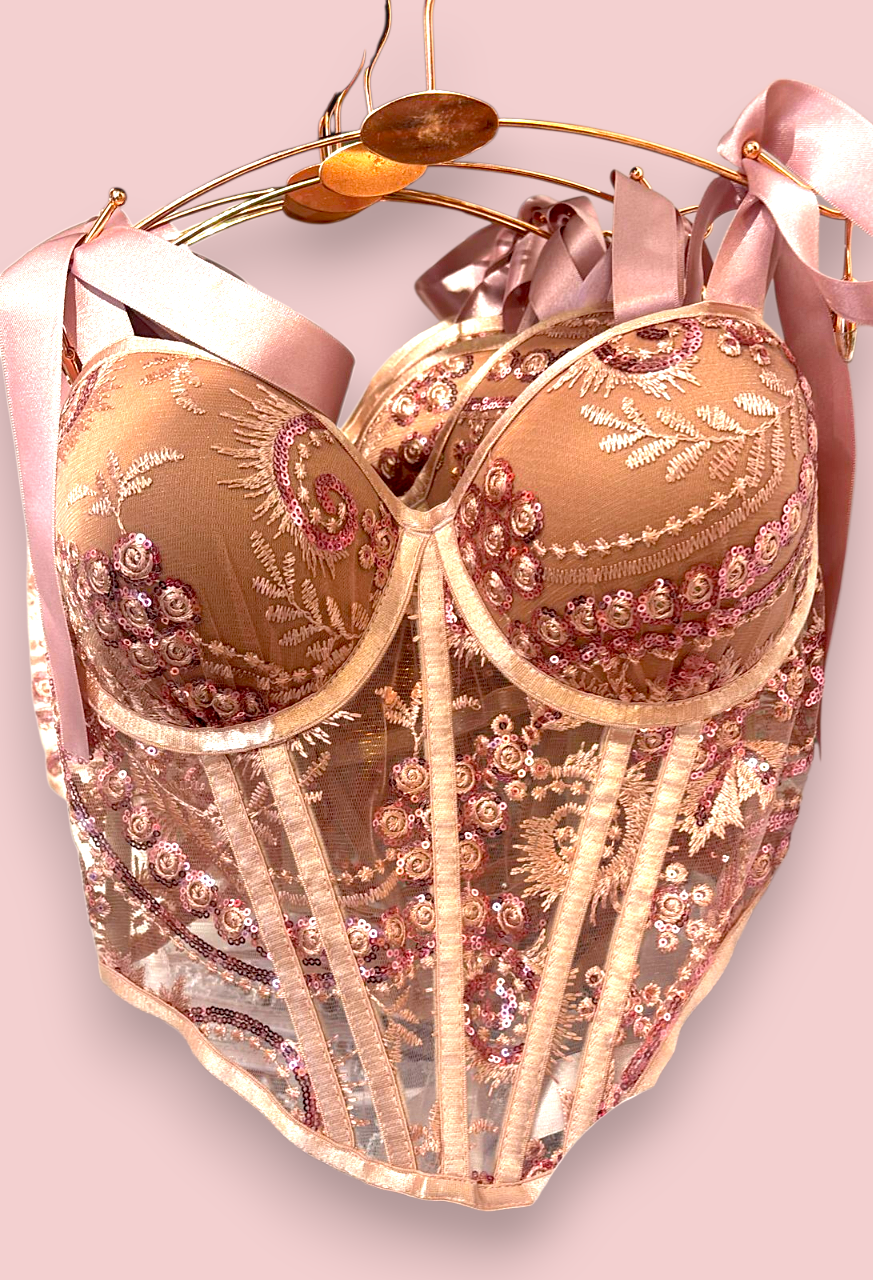 Este corset coquet cuenta con copas moldeadas y reforzadas con aros que brindan soporte excepcional y realzan tu silueta natural. La decoración artesanal incluye lentejuelas en tonos rosa antiguo y cobre que forman elegantes motivos florales, creando un efecto brillante y romántico. Los bordados delicados en hilo complementan el diseño con texturas suaves al tacto.